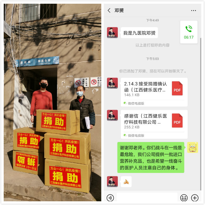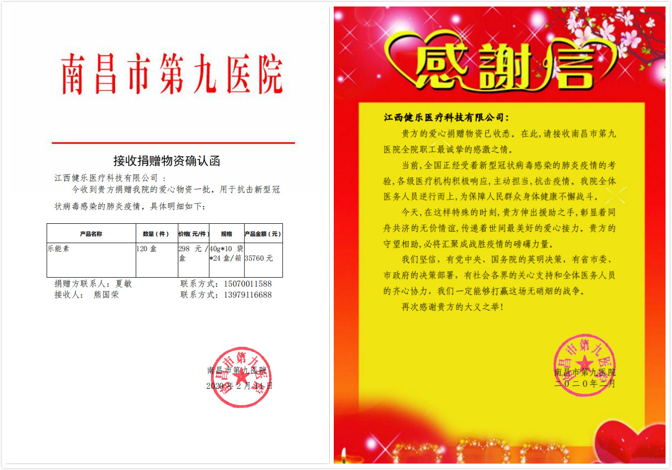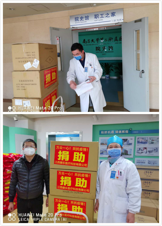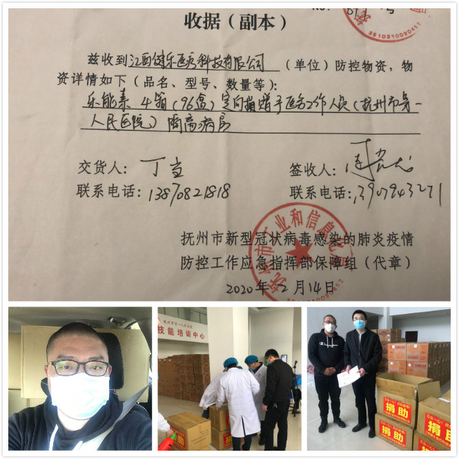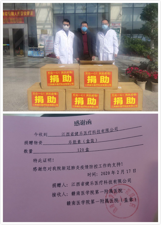 2月14日,在總經理甘志強先生的帶領下,江西健樂醫療的全體員工緊急行動,協調公司在寧波港保稅區倉庫,迅速組織一批價值15萬元的臺灣原裝進口醫學營養樂能素調往南昌,分批捐助至江西省醫療系統相關醫院,為一線醫務工作者提供充足的營養保障,提高免疫力,減少病毒感染風險。