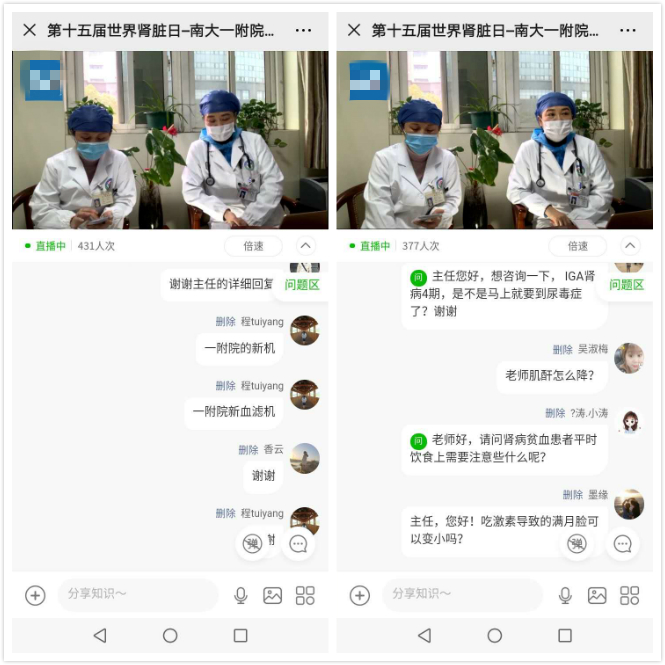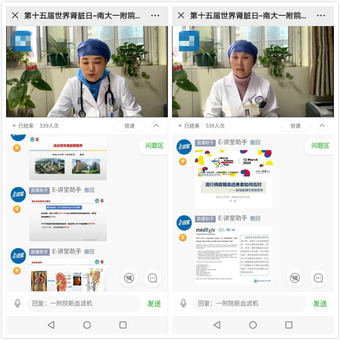 授課結束后,鄢艷主任、肖俊副主任針對病友們提出的問題耐心仔細的進行解答,病友們也非常感謝。最后由于時間關系,“世界腎臟日”南大一附網上直播活動暫時告一段落,本次網上直播活動最高峰參與人數539人。