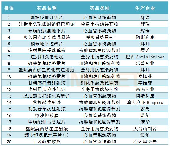 20個藥品中,有16個藥品的生產(chǎn)企業(yè)為外資企業(yè)。藥品數(shù)量最多的生產(chǎn)企業(yè)輝瑞、諾華均有3個藥品在列,輝瑞的3個藥品阿托伐他汀鈣片、注射用頭孢哌酮鈉舒巴坦鈉、苯磺酸氨氯地平片更是稱霸前三甲。據(jù)米內(nèi)網(wǎng)數(shù)據(jù),這20個藥品多數(shù)是相關(guān)生產(chǎn)企業(yè)在中國公立醫(yī)療機構(gòu)終端的主要銷售品種。