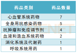 根據(jù)藥品治療類別,20個藥品中有7個為心血管系統(tǒng)藥物,全身用抗感染藥物有5個,抗腫瘤和免疫調(diào)節(jié)劑有4個,血液和造血系統(tǒng)藥物有2個,消化系統(tǒng)及代謝藥和呼吸系統(tǒng)用藥各有1個。