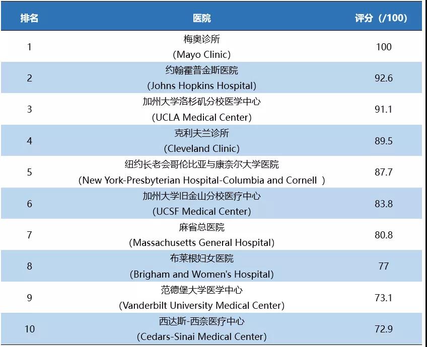 其中,約翰霍普金斯醫(yī)院由去年的第三升至第二,加州大學(xué)洛杉磯分校醫(yī)學(xué)中心由去年的第五升至第三,而克利夫蘭診所(Cleveland Clinic)則由去年的排名第二降至第四。