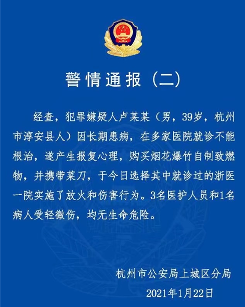 據該院發布的官方通告,4人正在接受治療,均無生命危險。本次突發事件與醫療活動無關,醫院各項工作開展正常。據初步了解,犯罪嫌疑人有犯罪前科,曾獲過刑。