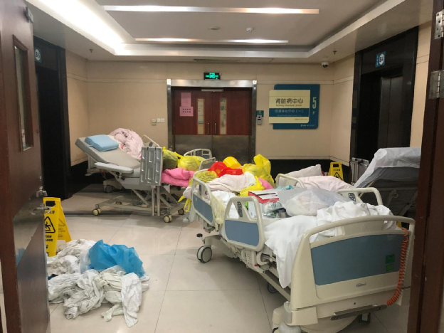 下午2時許,該院6號樓已解封,B區設有腎臟病中心與肝膽胰外科中心。“醫學界”觀察到,事發的5層為血液凈化中心1區(下簡稱血透1中心區),電梯口外堆放了四張病床和部分床單,場面凌亂不堪。一小時后,兩張病床被清理。