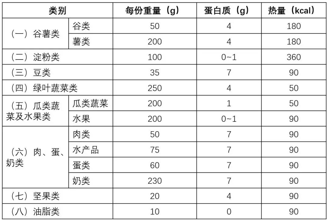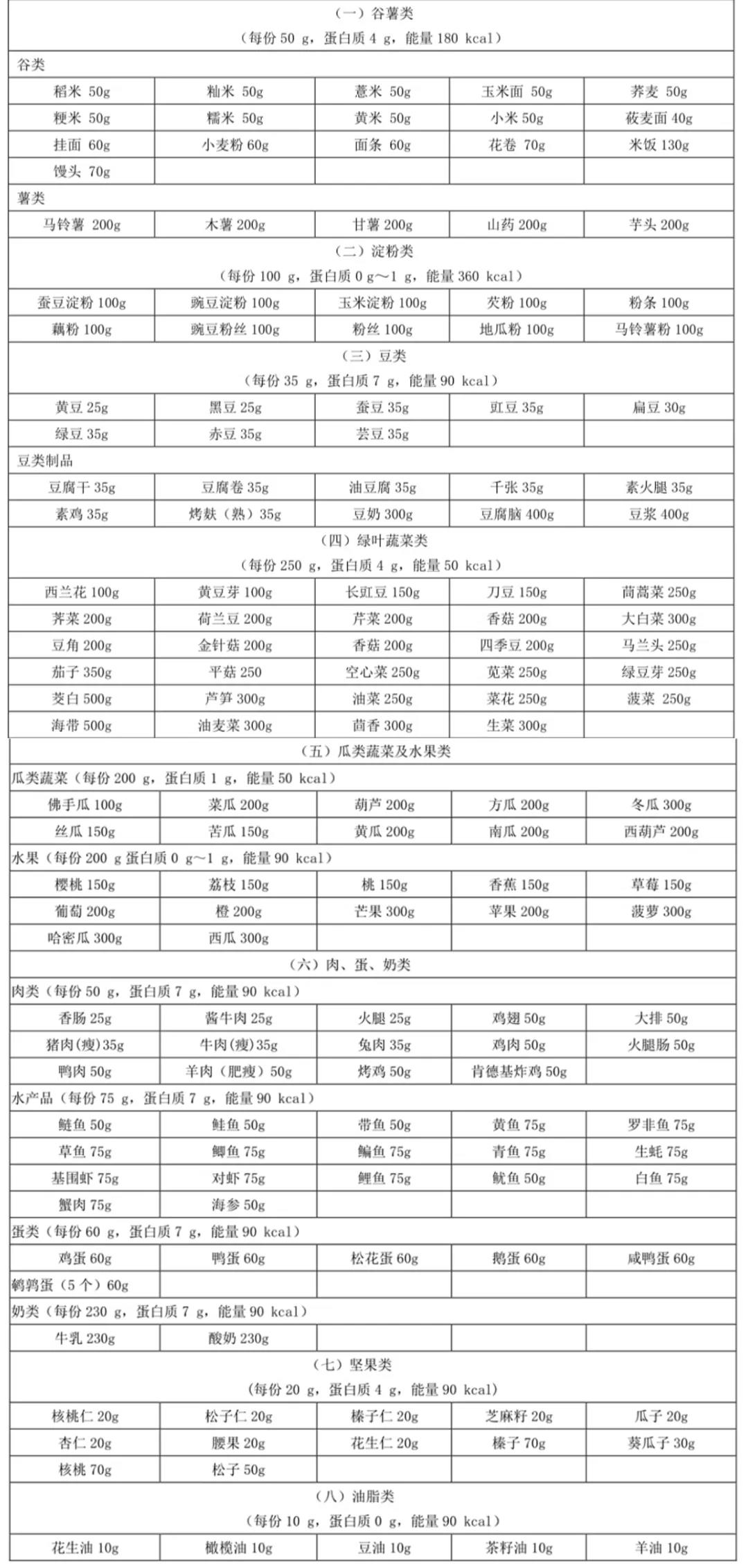 2017年8月1日,中華人民共和國(guó)國(guó)家衛(wèi)生和計(jì)劃生育委員會(huì)發(fā)布了中華人民共和國(guó)衛(wèi)生行業(yè)標(biāo)準(zhǔn)-慢性腎臟病患者膳食指導(dǎo)(WS/T557—2017)。按照常見(jiàn)各類(lèi)食物中的蛋白質(zhì)含量以每份0 g~1g, 4g, 7g為標(biāo)準(zhǔn)分為八類(lèi)食物,同類(lèi)食物在一定重量?jī)?nèi)所含的蛋白質(zhì)和能量相似,同類(lèi)食物間可以互換。