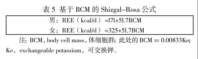 在對體重、身高、年齡、性別及體細胞群(bodycell mass,BCM)進行綜合分析后,Roza AM 及 Shizgal HM 發現,傳統 HBE 的年齡、性別、身高及體重 4 個變量實際上都與 BCM 密切相關,或者說可以由 BCM 替代,所以,他們又提出了基于 BCM 的另外一個 REE 計算公式,如表 5。