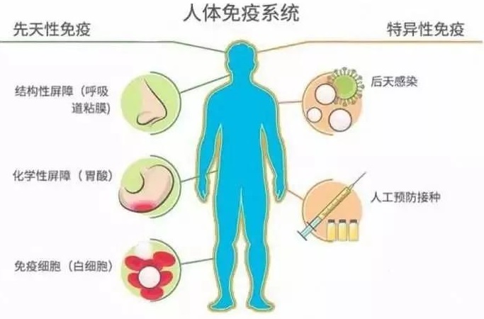 免疫力可分為:先天性免疫,即人一生下來就有的免疫力;另一種為獲得性免疫,是在生活過程中自然獲得的,或者用人工輔助的方法被動得到,如接種疫苗等。