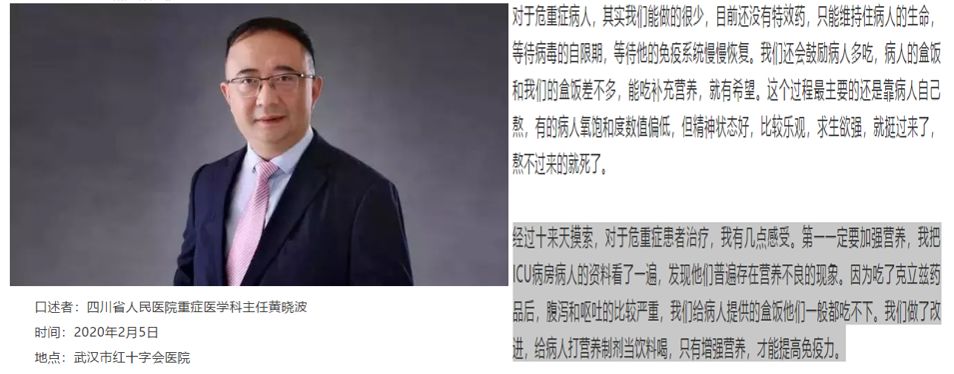 營養(yǎng)是維持生命的先決條件,是保障心身健康的物質(zhì)基礎(chǔ),也是人體康復(fù)的重要條件。沒有營養(yǎng),何以康復(fù)?據(jù)來自武漢抗疫一線的,四川省人民醫(yī)院重癥醫(yī)學(xué)科黃曉波主任口述:經(jīng)過十來天摸索,對于危重癥患者治療,第一一定要加強(qiáng)營養(yǎng)……發(fā)現(xiàn)他們普遍存在營養(yǎng)不良的現(xiàn)象...給病人提供的盒飯他們一般都吃不下。我們做了改進(jìn),給病人打營養(yǎng)制劑當(dāng)飲料喝,只有增強(qiáng)營養(yǎng),才能提高免疫力。