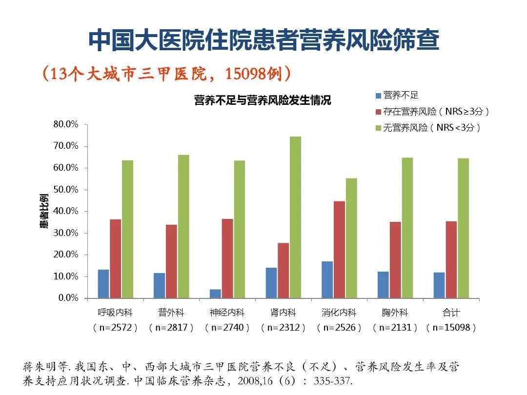在我國13個(gè)大城市所在的三甲醫(yī)院,一項(xiàng)納入15098例住院患者的調(diào)查中,存在營養(yǎng)風(fēng)險(xiǎn)的達(dá)35%左右(如下圖)。