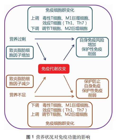 營養(yǎng)狀況不僅影響身體成分與體型,還影響生理結(jié)構(gòu)與功能。營養(yǎng)不良不僅表現(xiàn)為體重的變化, 更表現(xiàn)為功能的障礙。免疫系統(tǒng)是人體健康的衛(wèi)士。大量研究證明,營養(yǎng)狀況與免疫功能密切相關(guān),細胞代謝變化影響免疫細胞功能。營養(yǎng)不足與免疫功能抑制有關(guān),后者增加了感染的易感性, 同時 提 升 了 對 一 些 自 身 免 疫 性 疾 病 的 保 護(protection against several types of autoimmune disease)。營養(yǎng)過剩與慢性低度炎癥有關(guān),后者提高 了代謝性疾病、心血管疾病風險,促進了自身反應(yīng)(autoreactivity),破壞了保護性免疫。