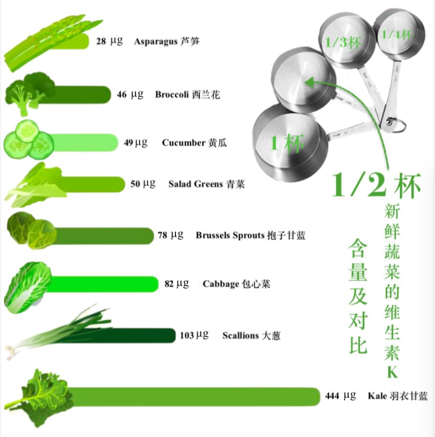 注:1杯≈240ml的量杯容量(內徑7.5cm,高5.5cm),此處維K為新鮮、未烹調的蔬菜在同等體積(1/2杯)情況下的含量。